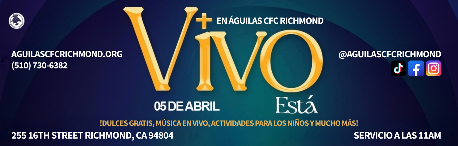 Águilas Centro Familiar Cristiano Richmond tiene una larga y orgullosa historia de servicio a la comunidad de Richmond y el Área de la Bahia. A través de la dedicación de nuestro liderazgo, pastores y voluntarios, estamos comprometidos con las enseñanzas de Jesucristo y estamos aquí para difundir el mensaje de las buenas nuevas de Jesus. Estamos abiertos a adoradores de todas las edades y orígenes, y nos esforzamos por guiar a todos los que adoran con nosotros hacia un amor más profundo por Dios.