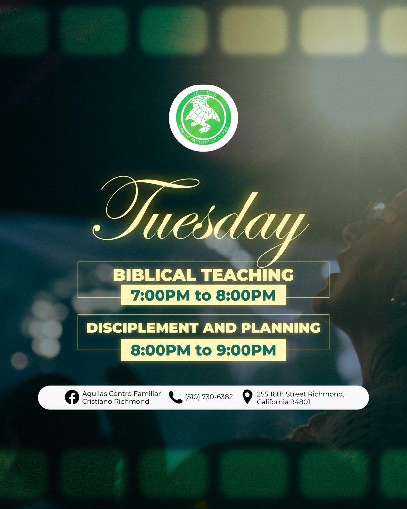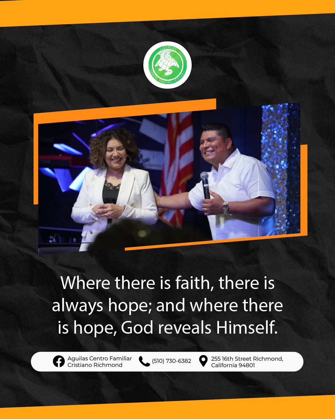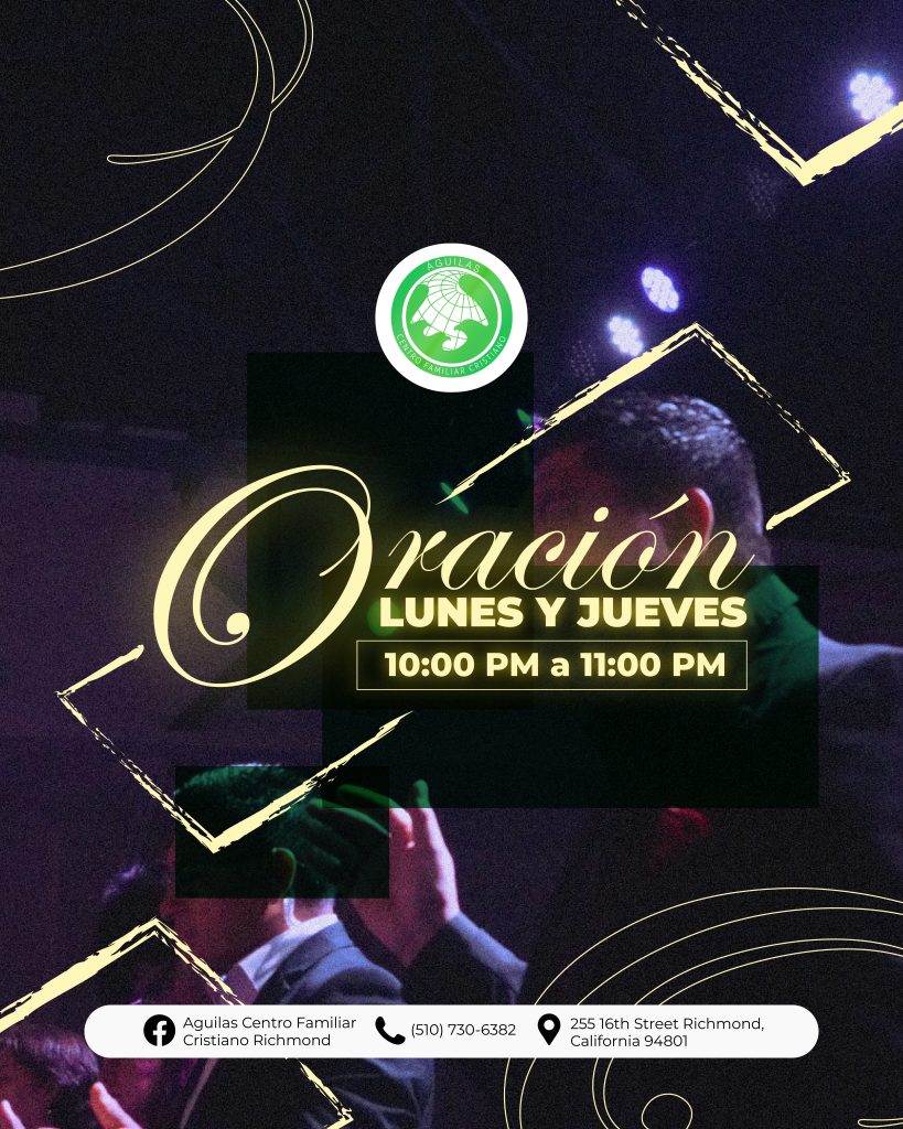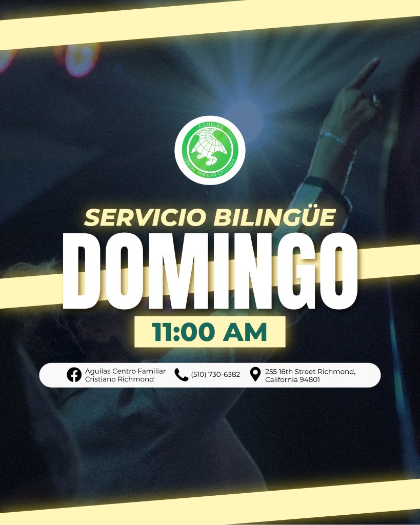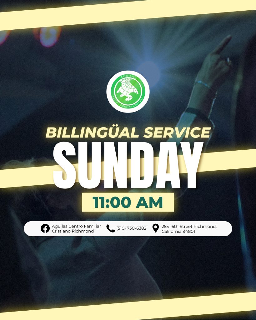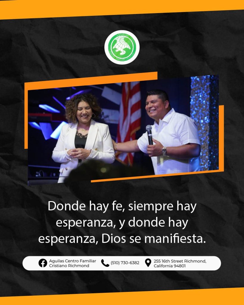 Águilas Centro Familiar Cristiano Richmond tiene una larga y orgullosa historia de servicio a la comunidad de Richmond y el Área de la Bahia. A través de la dedicación de nuestro liderazgo, pastores y voluntarios, estamos comprometidos con las enseñanzas de Jesucristo y estamos aquí para difundir el mensaje de las buenas nuevas de Jesus. Estamos abiertos a adoradores de todas las edades y orígenes, y nos esforzamos por guiar a todos los que adoran con nosotros hacia un amor más profundo por Dios.