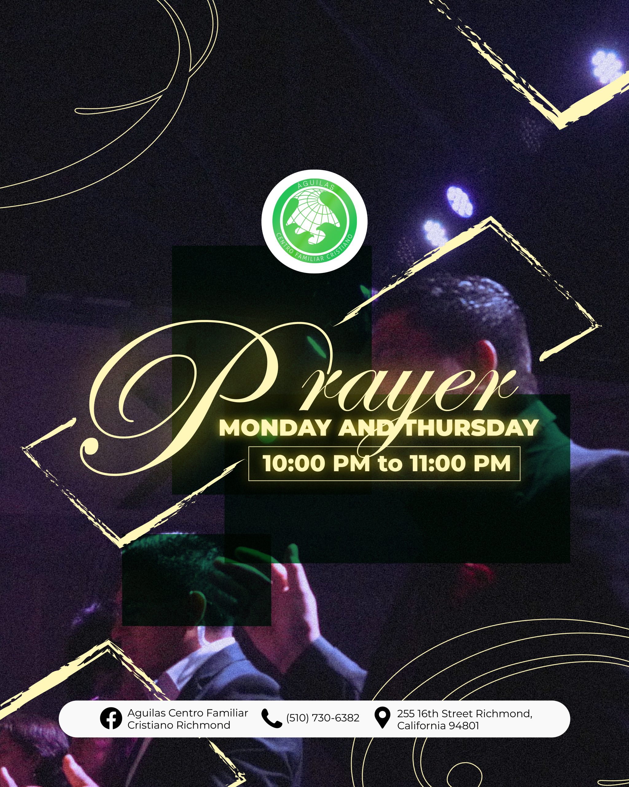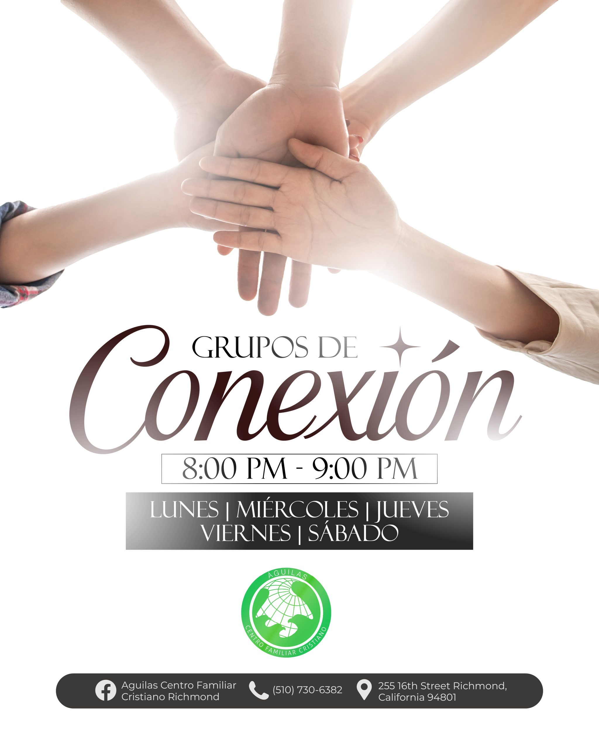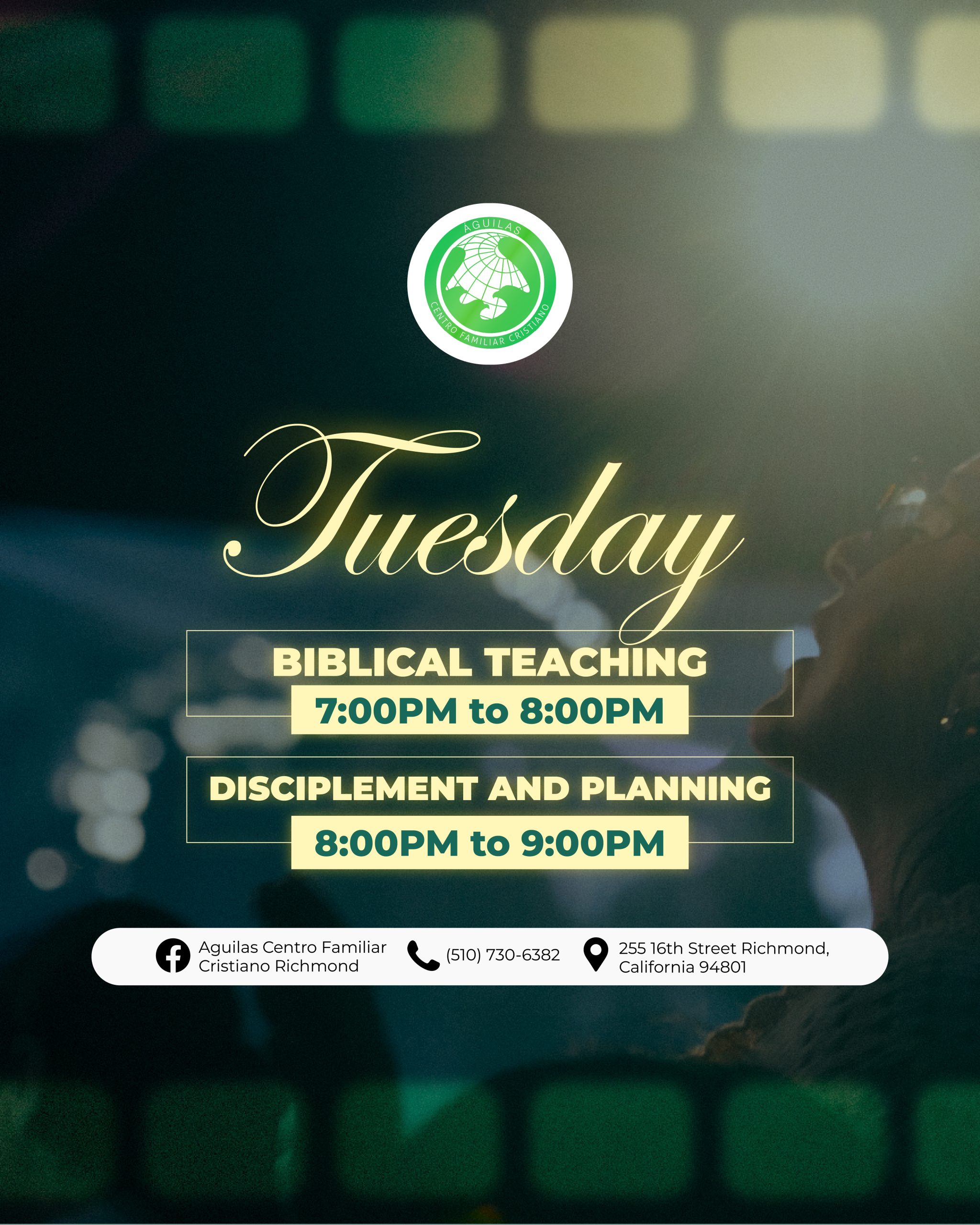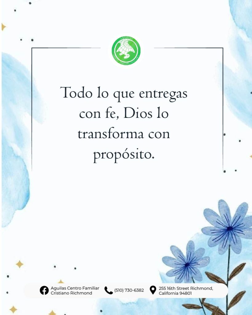Águilas Centro Familiar Cristiano Richmond tiene una larga y orgullosa historia de servicio a la comunidad de Richmond y el Área de la Bahia. A través de la dedicación de nuestro liderazgo, pastores y voluntarios, estamos comprometidos con las enseñanzas de Jesucristo y estamos aquí para difundir el mensaje de las buenas nuevas de Jesus. Estamos abiertos a adoradores de todas las edades y orígenes, y nos esforzamos por guiar a todos los que adoran con nosotros hacia un amor más profundo por Dios.