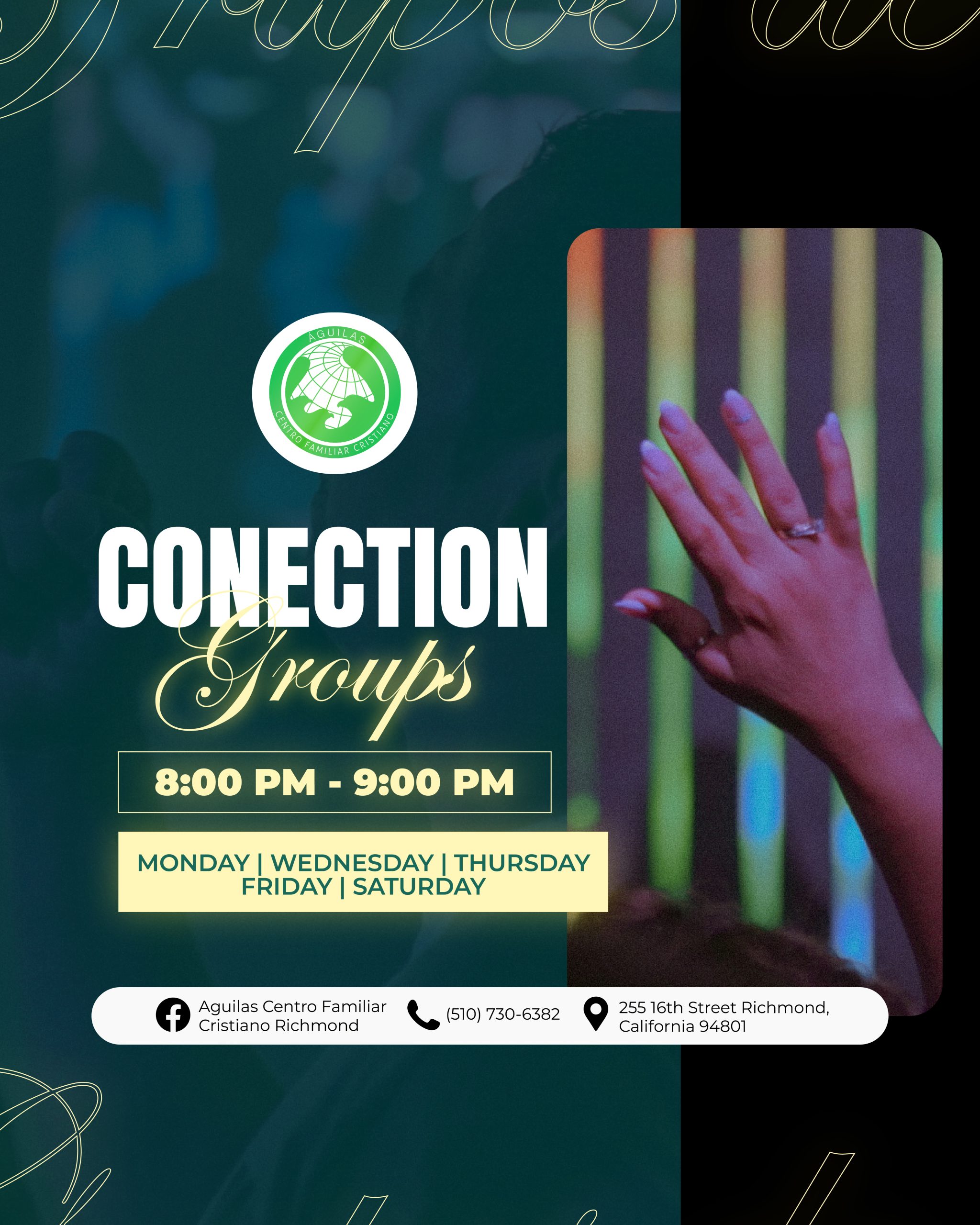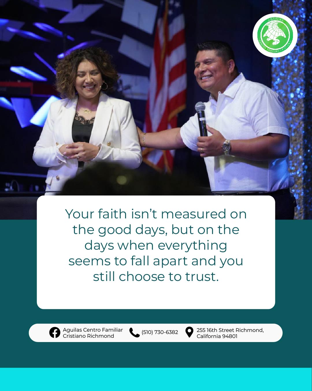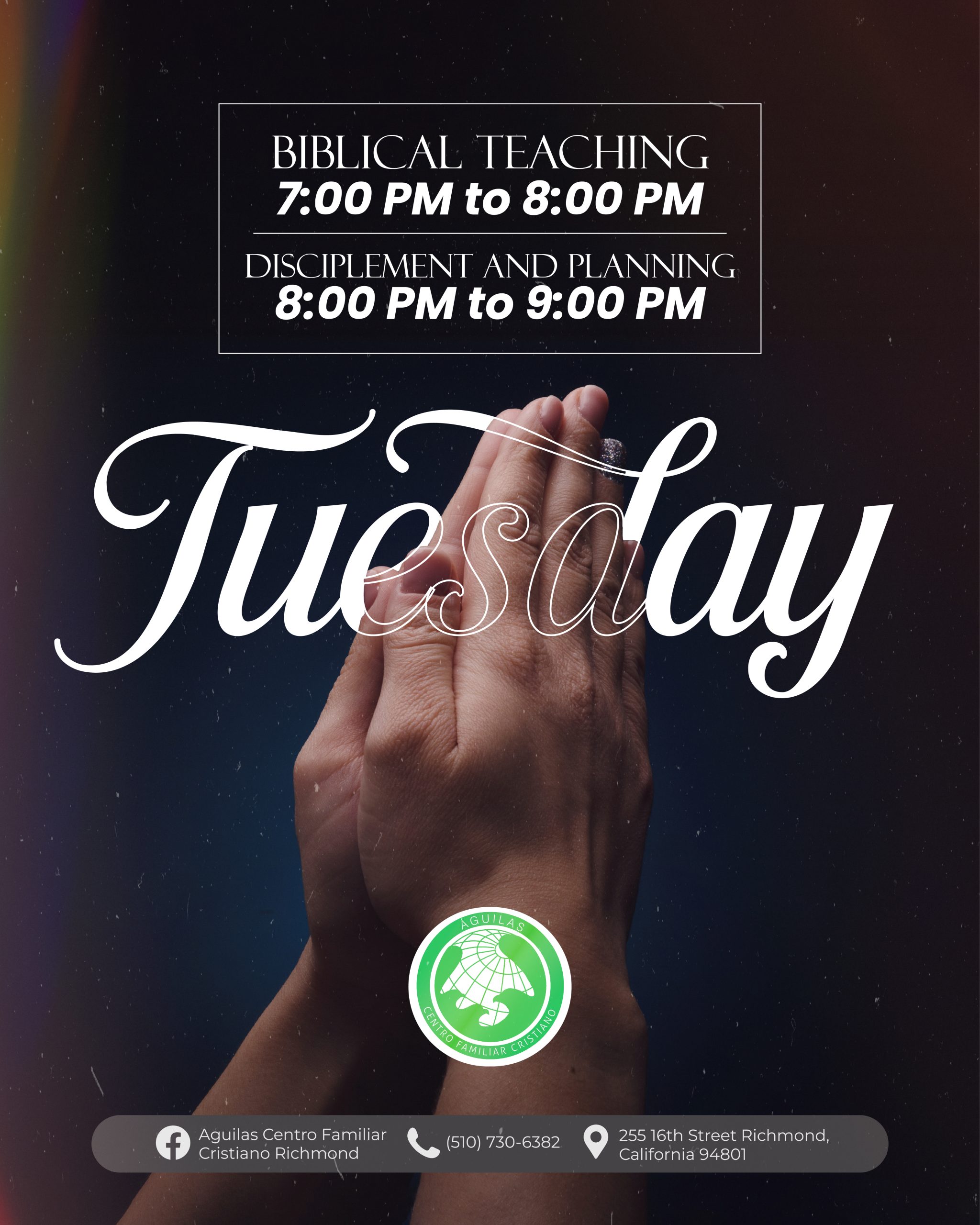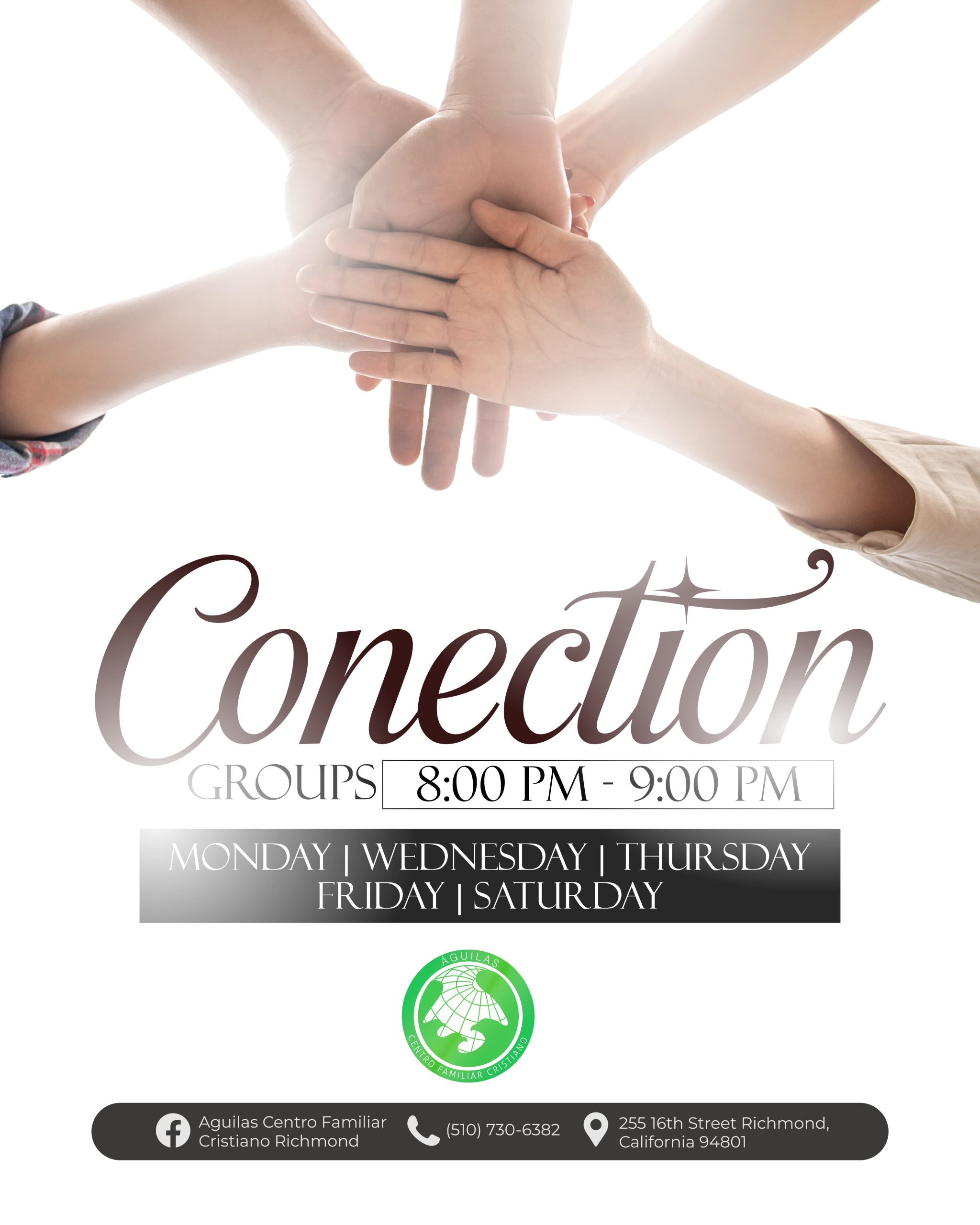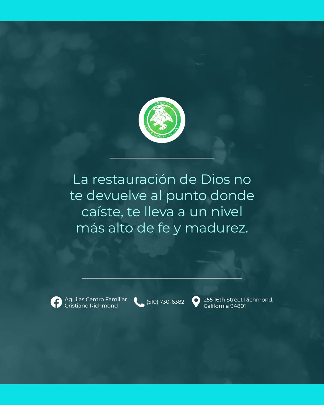 Águilas Centro Familiar Cristiano Richmond tiene una larga y orgullosa historia de servicio a la comunidad de Richmond y el Área de la Bahia. A través de la dedicación de nuestro liderazgo, pastores y voluntarios, estamos comprometidos con las enseñanzas de Jesucristo y estamos aquí para difundir el mensaje de las buenas nuevas de Jesus. Estamos abiertos a adoradores de todas las edades y orígenes, y nos esforzamos por guiar a todos los que adoran con nosotros hacia un amor más profundo por Dios.